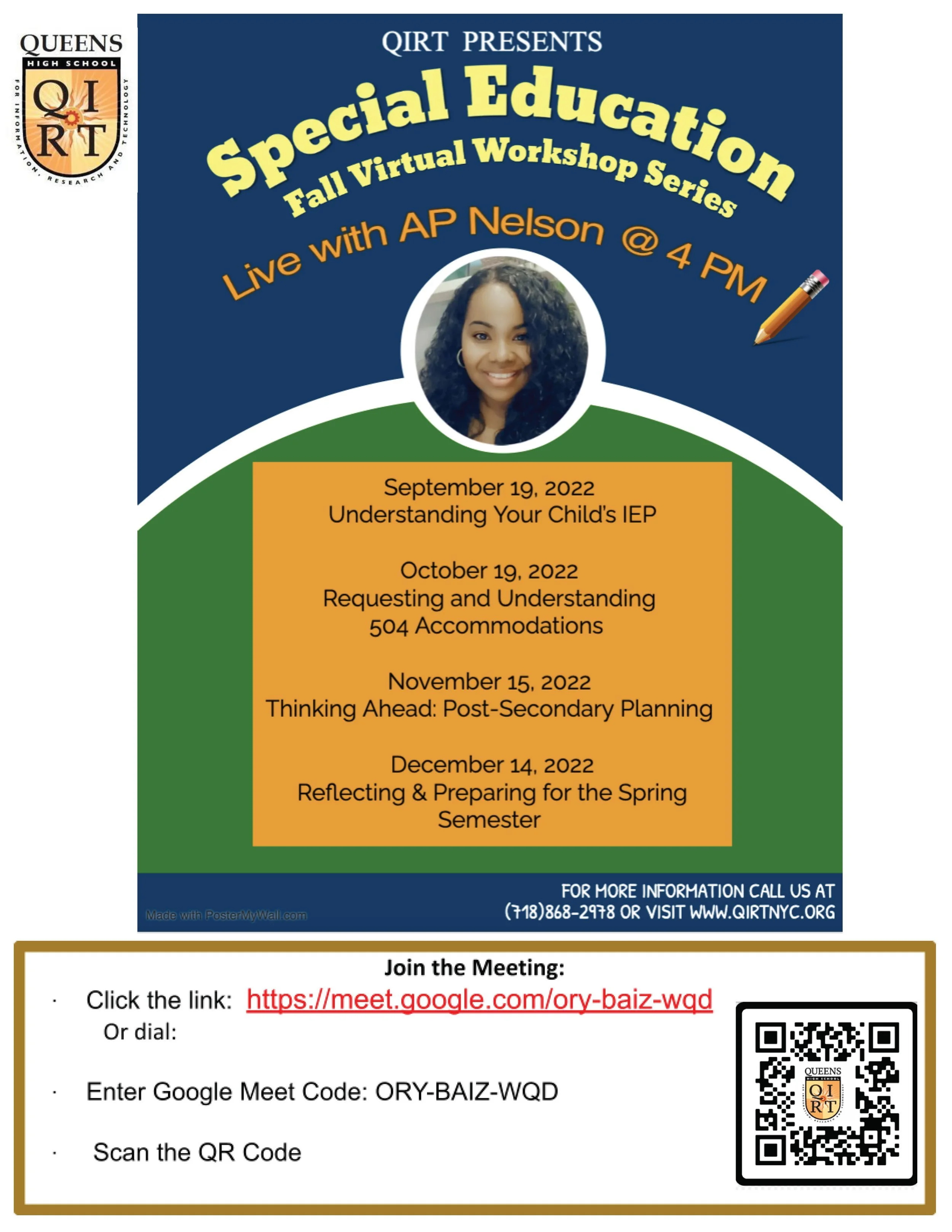 Here at QIRT, we do all we can to support students with disabilities, and their families! In keeping with this mindset, AP Nelson has been conducting a monthly workshop to support students and families as they navigate the academic and professional world. Please join us for the next installment!